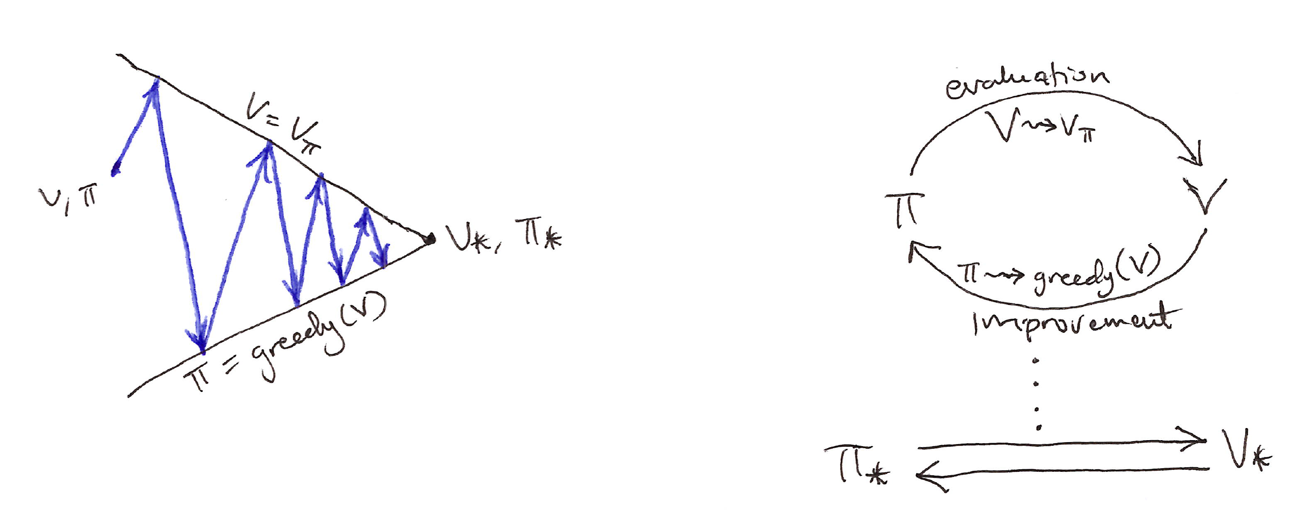 - If improvements stop: q_\pi(s, \pi'(s)) = \max_{a \in A} q_\pi(s,a) = q_\pi(s, \pi(s)) = v_\pi(s)