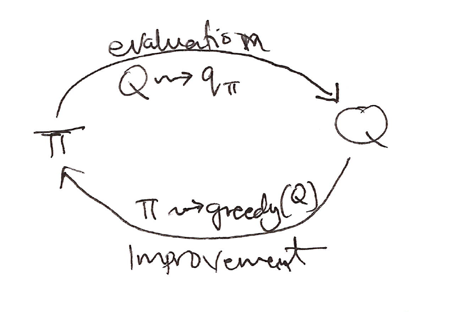 where \xrightarrow{E} denotes a complete policy evaluation & \xrightarrow{I} denotes a complete policy improvement.
