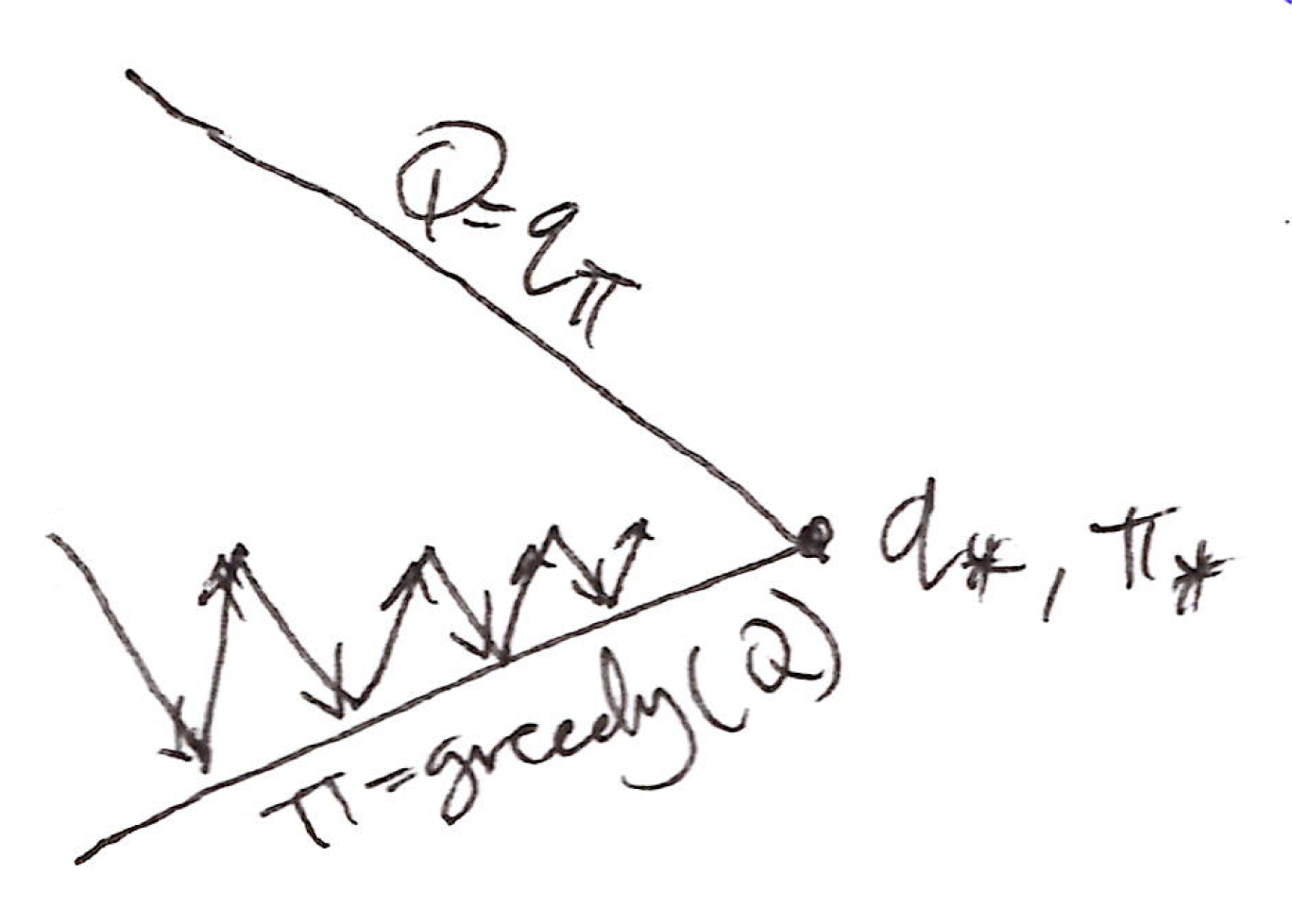 - As in all on-policy methods, we continually estimate q_\pi for the behavior policy \pi & simultaneously update the policy \pi greedily w.r.t. q_\pi.