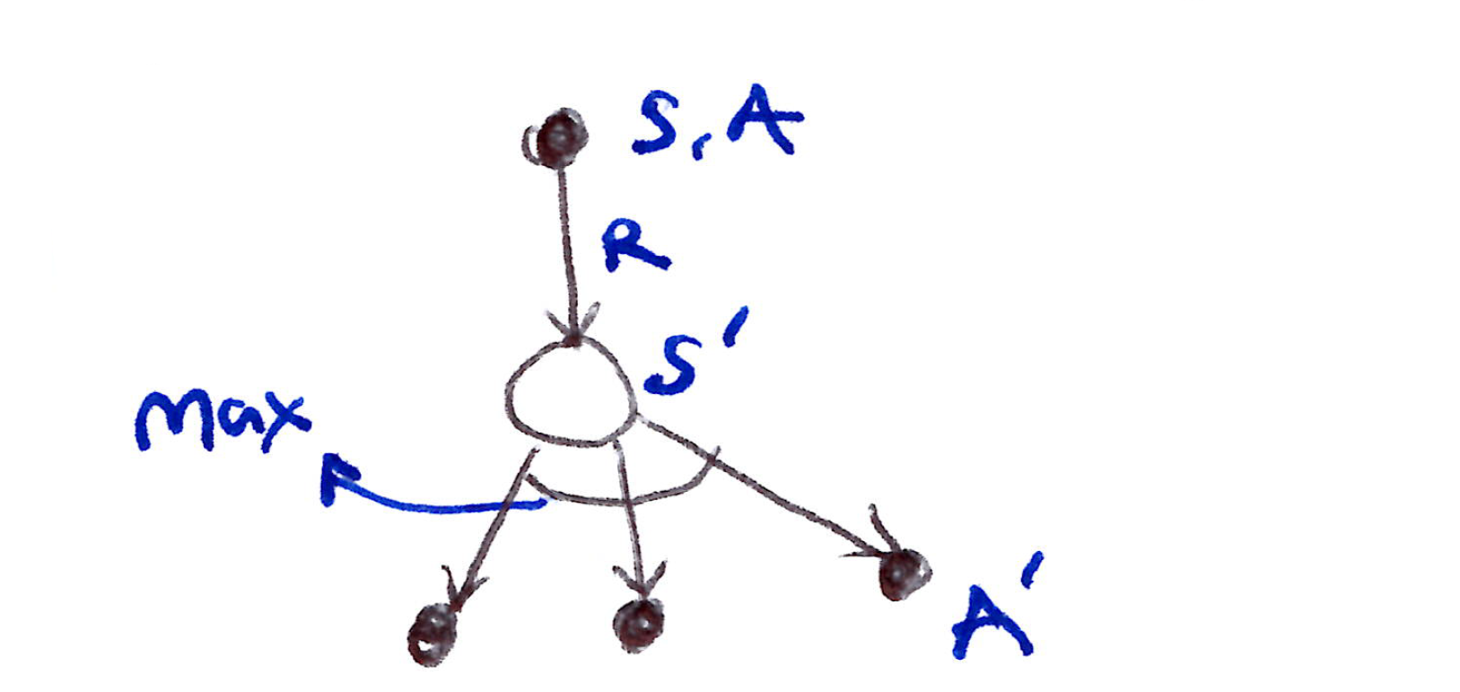 R_{t+1} + \gamma Q(S_{t+1}, A') = R_{t+1} + \gamma Q\!\left(S_{t+1}, \arg\max_{a'} Q(S_{t+1}, a')\right) = R_{t+1} + \gamma \max_{a'} Q(S_{t+1}, a')