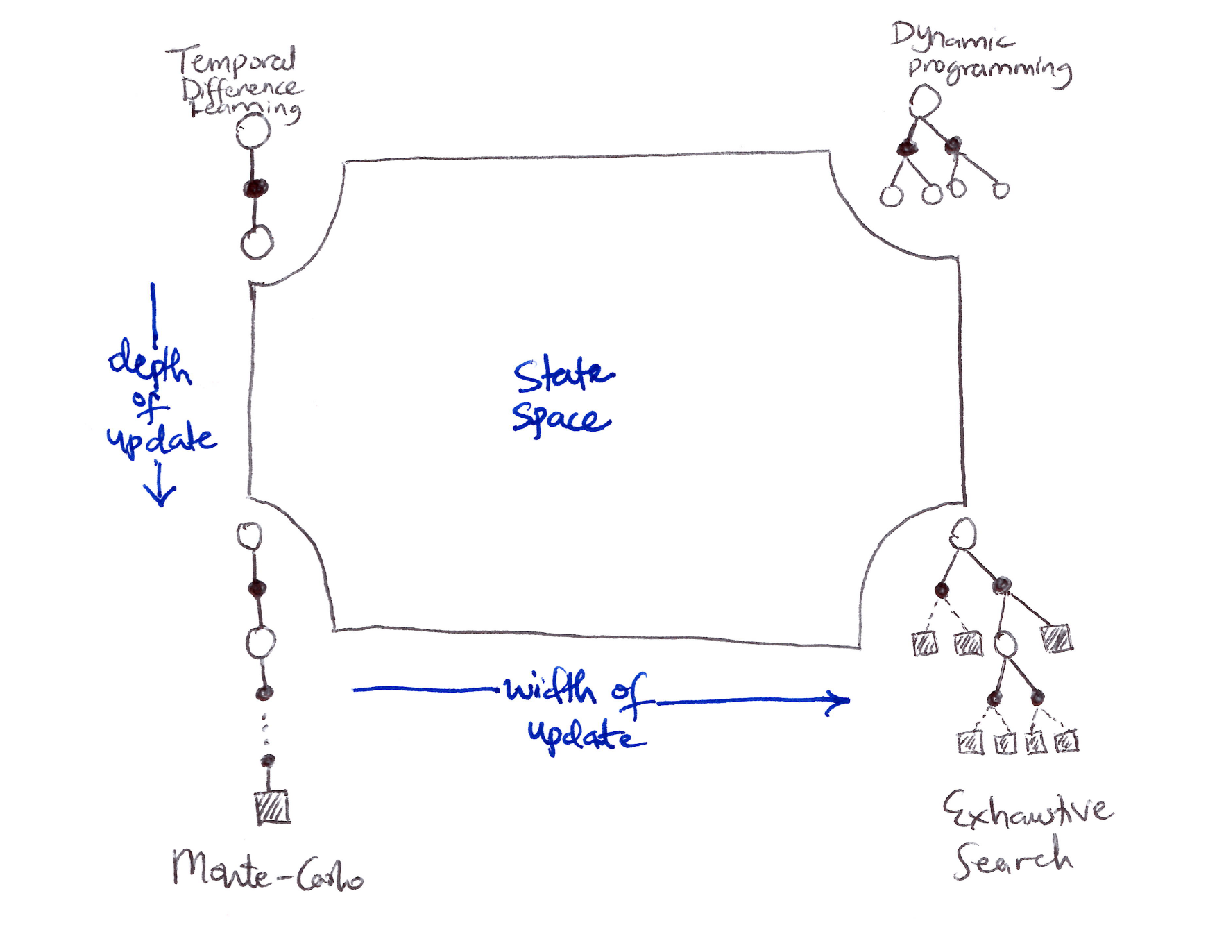 \text{HORIZONTAL (L to R): sample backups} \xrightarrow{\text{width of update}} \text{full/expected backups} \text{VERTICAL (Top to Bottom): shallow backups} \xrightarrow{\text{depth/length of update}} \text{deep backups}
