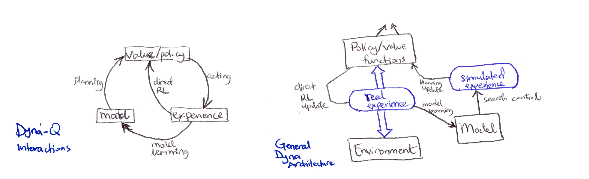 Dyna-Q includes all of the RL processes in the interactions diagram shown above occurring continuously: planning, acting, model-learning, and direct RL.
